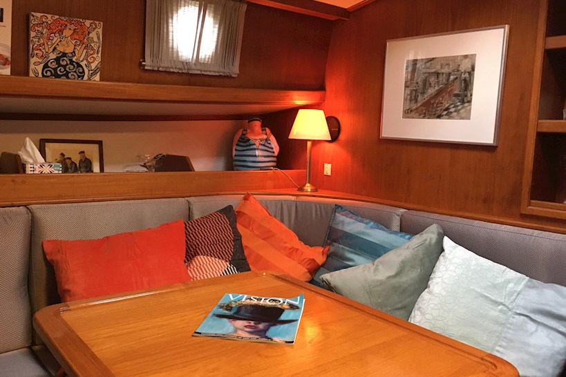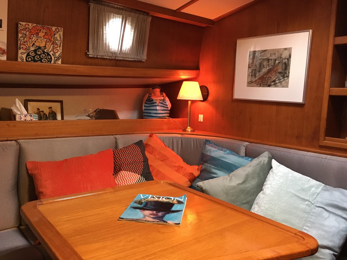 Klassiek maritiem interieur met warm teakhout, lichtgrijze bekleding en een sfeervolle, degelijke afwerking. Tijdloos en verzorgd, met een gezellige en praktische indeling.